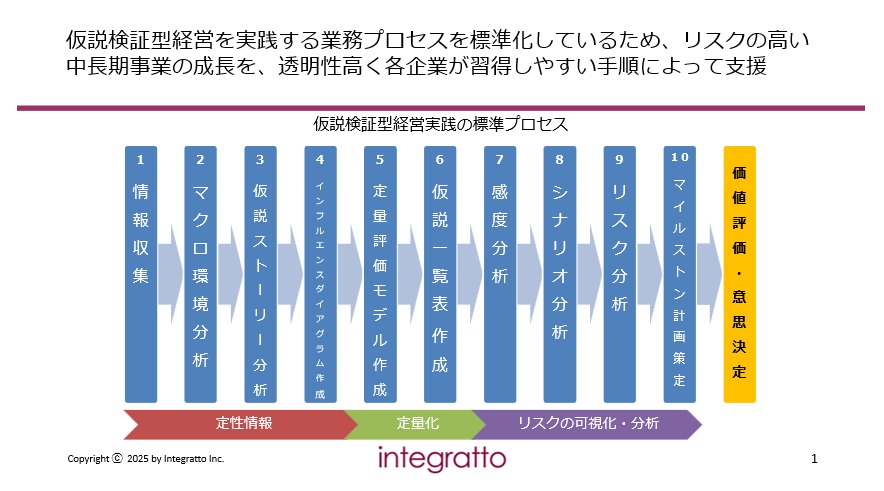 しかし、2030年・2035年などを目指す中長期計画で、利益目標等の計画数値だけが示されていて、仮説が説明されていない例は、枚挙にいとまがありません。新規事業・研究開発・設備投資・M&Aといった不確実性の高い事業だけでなく、各企業の業績を支える既存事業の中長期計画でも、計画数値だけが示されていて、目標の達成に必要な仮説が共有されていない状況が、弊社顧客企業にもありました。インテグラートでは、このような企業が自ら仮説を明確にできるように、汎用性の高い手法(業務プロセス)を整理したい、と考えるようになりました。